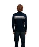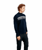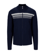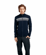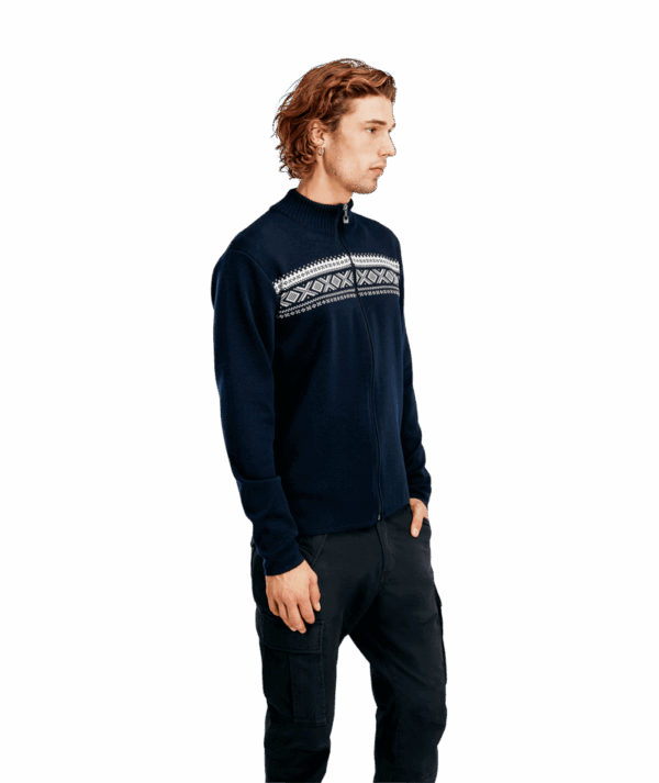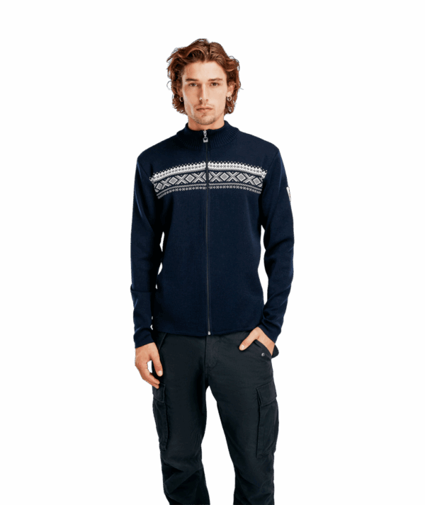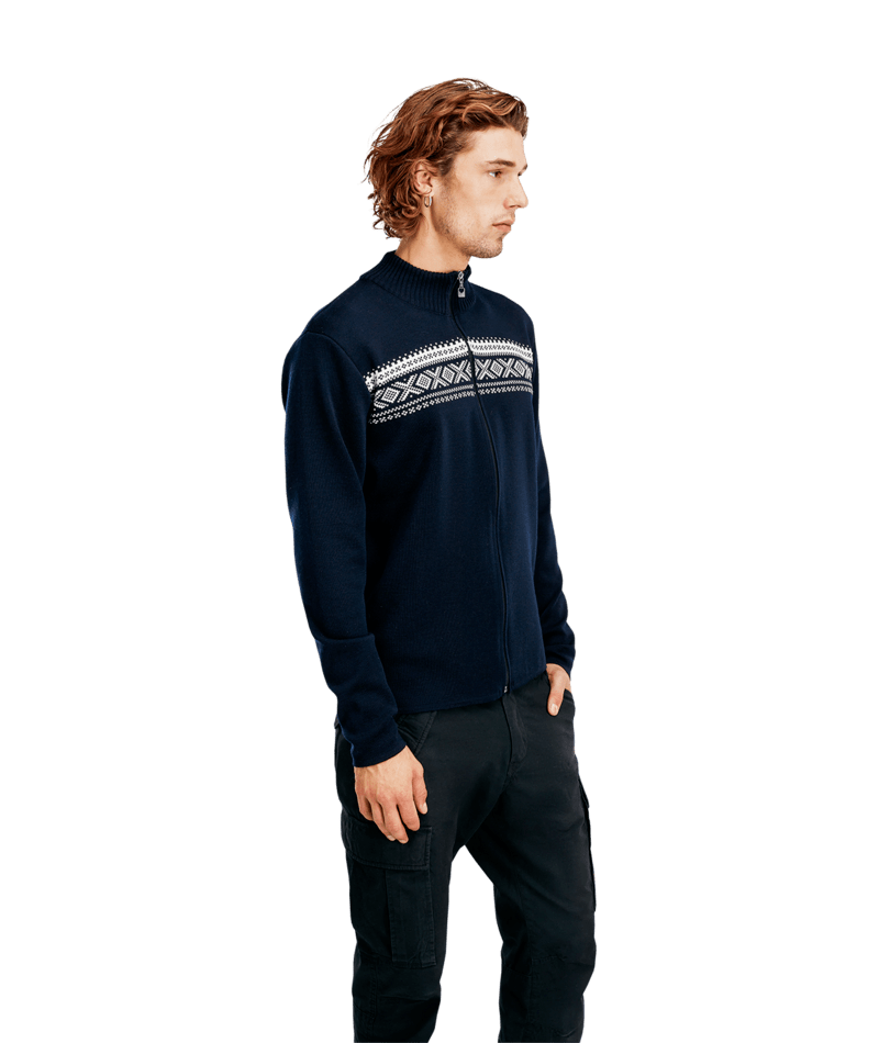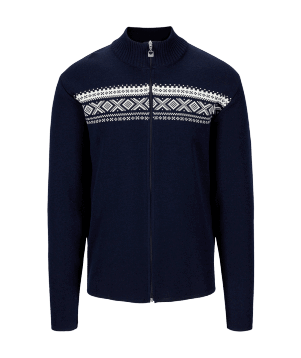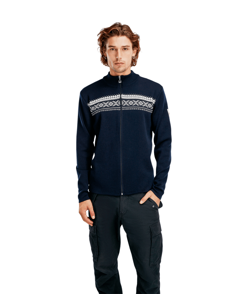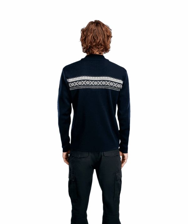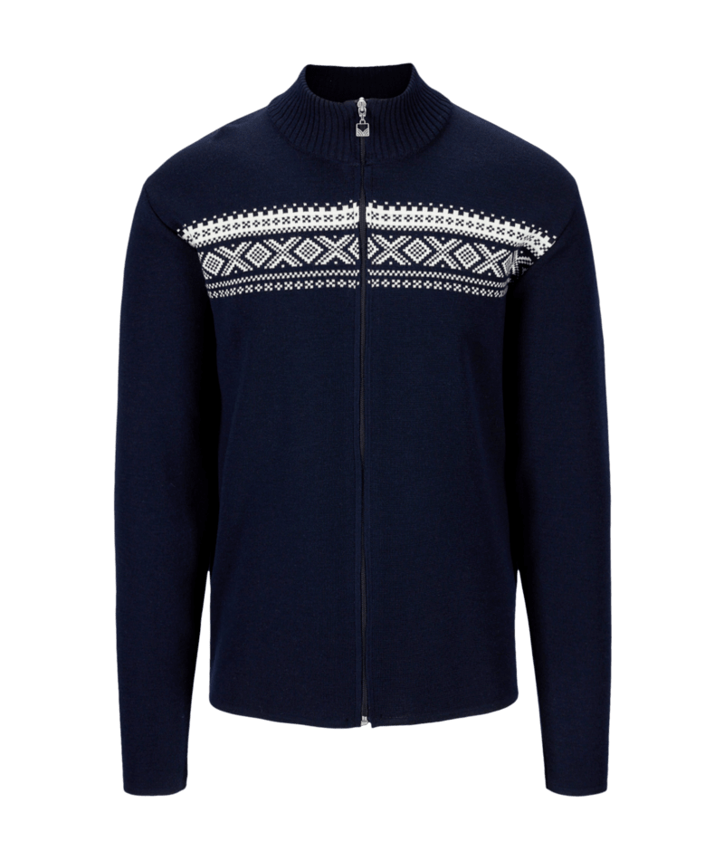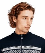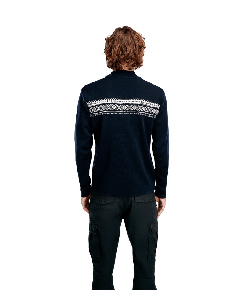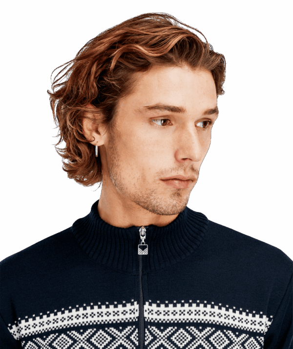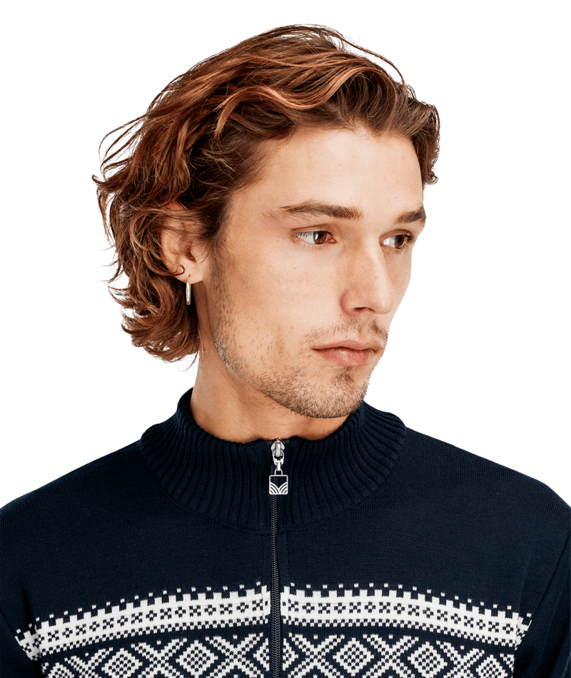 The Dalestølen merino wool jacket is a lighter and sportier version of the iconic Cortina 1956 sweater. The jacket is made of 100% soft merino wool. The sweater has an updated version of the Cortina pattern, with a high neck and zipper.