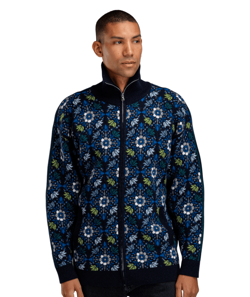 The Fjære jacket is a full zip jacket with a high neck and rib finish details. Crafted with a blend of eight different yarn colors, this knitted jacket ensures you stay both colorful and warm on even the chilliest of days. With its relaxed fit, T-sleeve insert, and convenient front pockets, the Fjære is as comfortable as it is striking. The jacket showcases a bold, allover pattern inspired by our Kvinesdal jacket, reimagined with captivating yarn colors. The detailed artwork draws inspiration from traditional Norwegian rosemaling – a decorative painting style rich in cultural heritage and known for its dynamic, intricate use of colors. The tulip, a central motif in the asymmetrical design, adds an elegant touch to the jacket’s lively composition.
