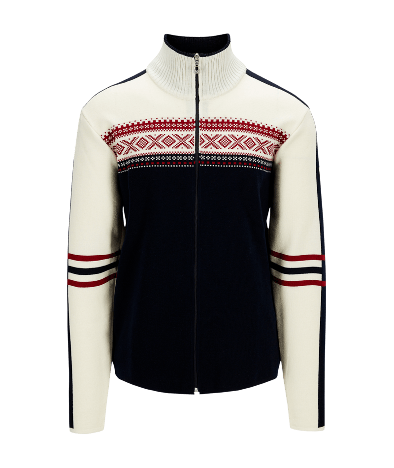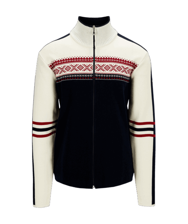This is the official team jacket for the Norwegian Alpine national team in the 2023/24 season. Snønipa is a lightweight and sporty wool jacket with Norwegian flag stripes on the sleeves and the pattern from our iconic Cortina 1956 sweater. The jacket is made of 100% soft merino wool and has a zipper and high neck.